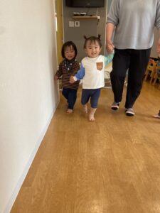 そして「さんぽ」の曲に合わせてお散歩したり、「せんろはつづくよどこまでも」の曲に合わせて電車ごっこもしたり😆