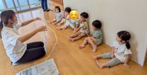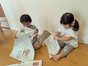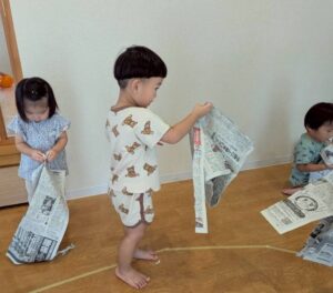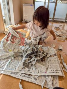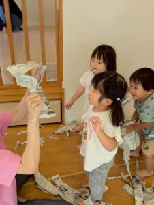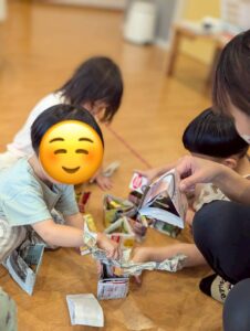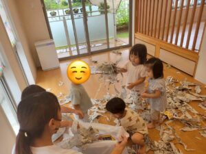 ビリビリ破いたり、くしゃくしゃ丸めたり、ダイナミックに楽しむ子どもたち😊