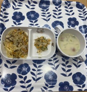 今日の給食です🍚 普通食…323kcal ⭐️きのこのスパゲッティ ⭐️ツナサラダ ⭐️豆乳スープ