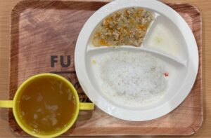 今日の給食です🍚 普通食・・・423kcal ⭐️白ご飯 ⭐️鶏肉のスタミナ焼き ⭐️コーンサラダ ⭐️わかめスープ