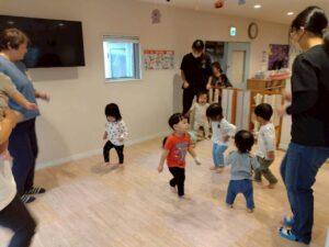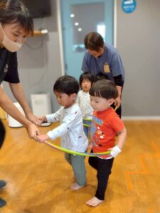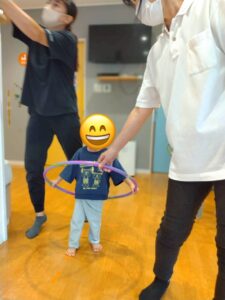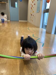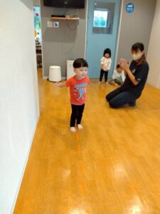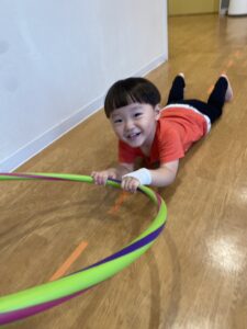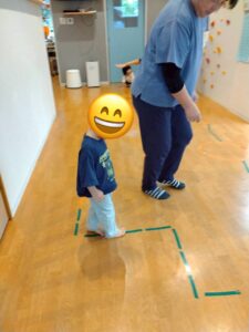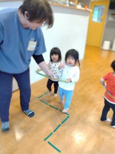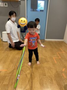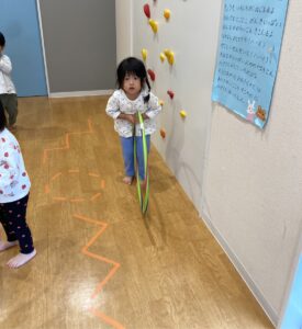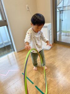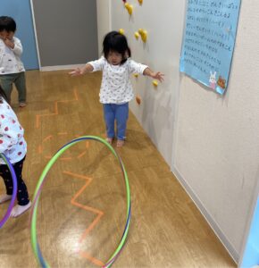 床にビニールテープを貼り、道に見立ててその上をいろいろな動物になりきって歩いたり、フラフープを使って遊んだりしましたよ😀✨