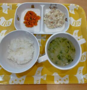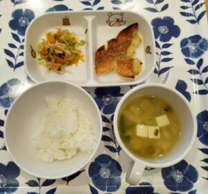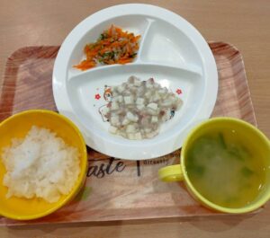 今日の給食です🍚 普通食・・・315kcal ⭐️白ご飯 ⭐️白身魚の味噌マヨ焼き ⭐️もやしの酢の物 ⭐️みそ汁