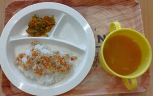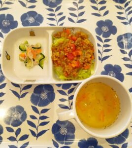 今日の給食です🍚 普通食・・・391kcal ⭐️タコライス ⭐️きゅうりサラダ ⭐️野菜スープ