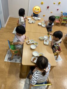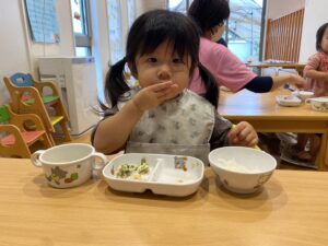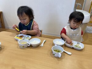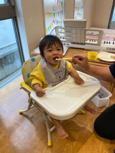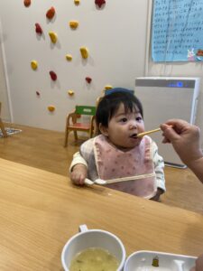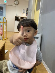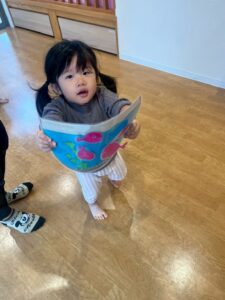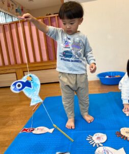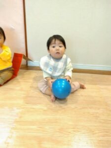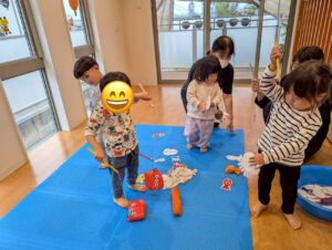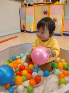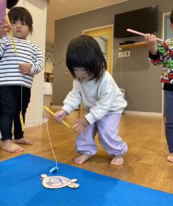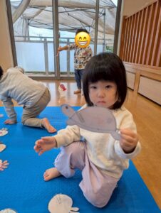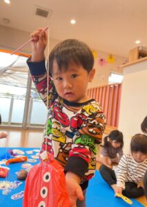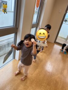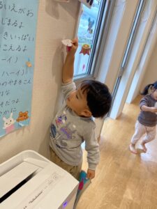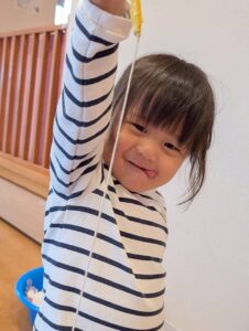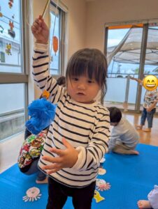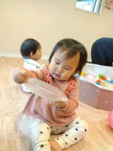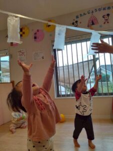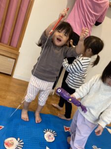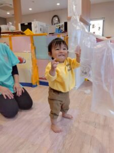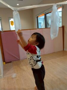 吊り下がっている袋に触れたり、引っ張ったりして楽しんでいたお友だち☺️