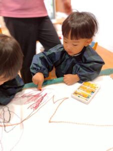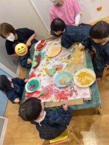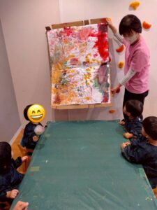保育士が大きな紙に木を描き、その木にクレヨンや絵の具で果物、お花などを描きました☺️