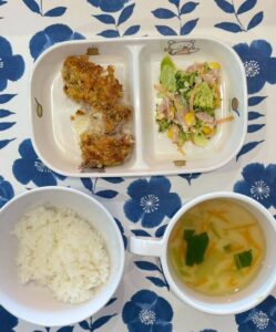 今日の献立です🍚 (普通食) ⭐️朝のおやつ ・市販菓子 ⭐️給食 ・白ご飯 ・白身魚の香草焼き ・ブロッコリーサラダ ・中華風スープ