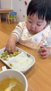 (後期食) ⭐️朝のおやつ ・市販菓子 ⭐️給食 ・白ごはん ・白身魚のブロッコリーあん ・野菜スープ