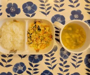 (後期食) ⭐️朝のおやつ ・市販菓子 ⭐️給食 ・白ご飯 ・鶏肉と野菜の煮物 ・みそ汁