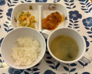 (後期食) ⭐️朝のおやつ ・市販菓子 ⭐️給食 ・白ご飯 ・鶏肉のキャベツあん ・みそ汁