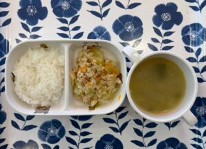 今日の献立です🍚 (普通食) ⭐️朝のおやつ ・市販菓子 ⭐️給食 ・白ご飯 ・鶏のチリソース風 ・キャベツとコーンのおかか和え ・みそ汁