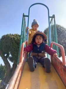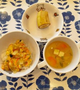 今日の献立です🍚 (普通食) ⭐️朝のおやつ ・市販菓子 ・牛乳 ⭐️給食 ・しらすの卵とじ丼 ・田舎風スープ ・バナナ