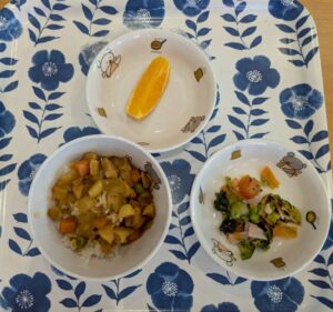 今日の献立です🍚 (普通食) ⭐️朝のおやつ ・市販菓子 ・牛乳 ⭐️給食 ・チキンカレー ・フレンチサラダ ・オレンジ