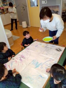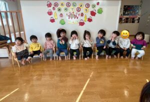 みんなの前に立つのは緊張していたお友だちでしたが、2歳になったことやケーキを食べることなどを教えてくれました😊👏