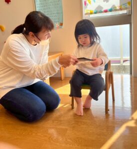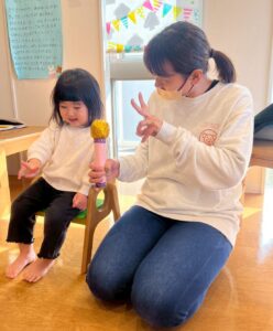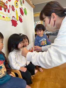 みんなの前に立つのは緊張していたお友だちでしたが、2歳になったことやケーキを食べることなどを教えてくれました😊👏
