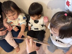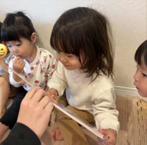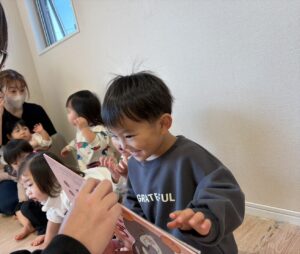 今朝の絵本の読み聞かせは「へんなところ」という絵本で、最後のページに鏡が付いていました♪みんな自分の顔が映り、興味津々でした😆