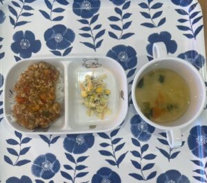 今日の献立です🍚 (普通食) ⭐️朝のおやつ ・市販菓子 ・牛乳 ⭐️給食 ・ドライカレー ・コールスローサラダ ・野菜スープ