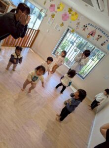 みんな保育士を上手に真似っこしたり、お友だちや保育士と握手したりしてふれあいながら楽しみました♪