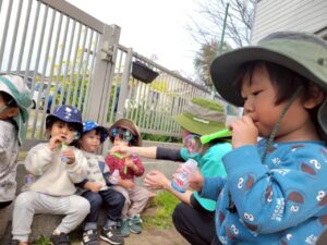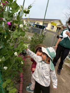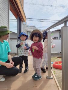 0歳児さんは芝生の上や砂利の上など色々な場所を歩いてみたり菜の花や、タンポポ、蝶々を見たりなど自然を楽しみました♪