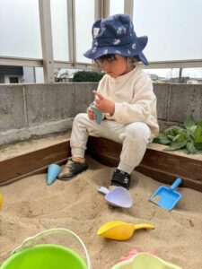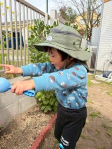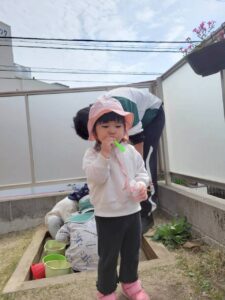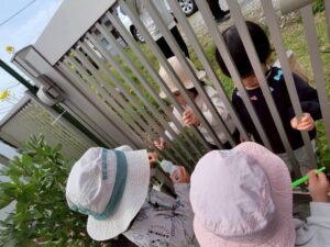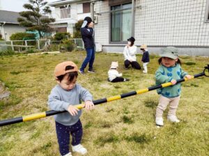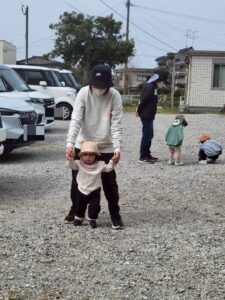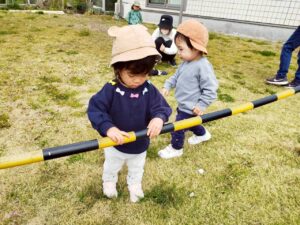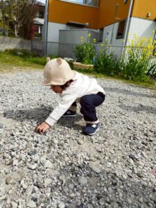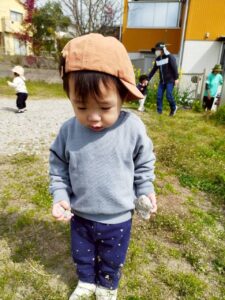 0歳児さんは芝生の上や砂利の上など色々な場所を歩いてみたり菜の花や、タンポポ、蝶々を見たりなど自然を楽しみました♪