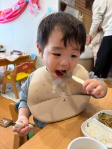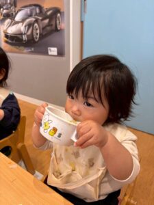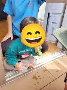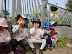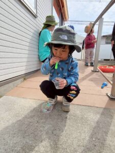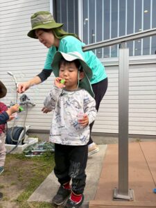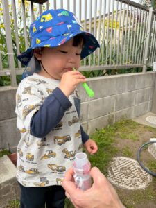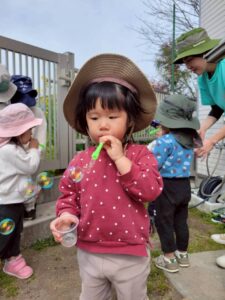 1,2歳児さんはシャボン玉遊びでシャボン玉を追いかけたり、どのくらいの強さで吹くとシャボン玉が出来るのか口周りの筋肉を使いながら息の調節を頑張っていました✨👏