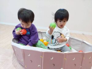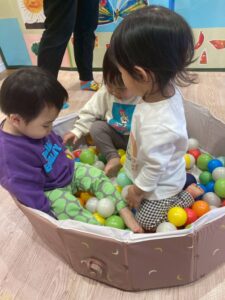 ボールプールではお風呂に見立てて身体を洗ったり、「あったかーい」という姿も見られました😊💕