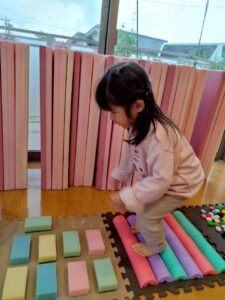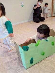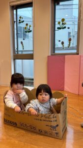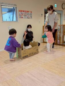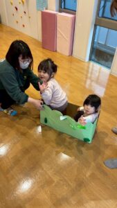 ダンボールの汽車では「しゅっぱつしんこう〜!」の声に嬉しそうな表情を見せてくれて、揺れる動きを楽しんでいました😊