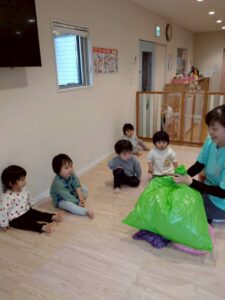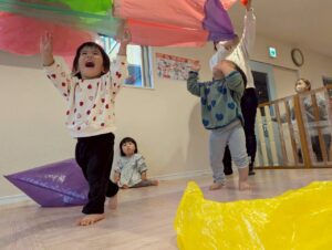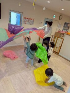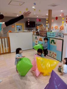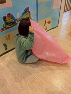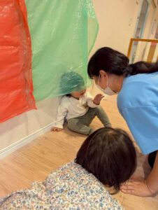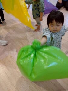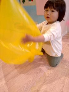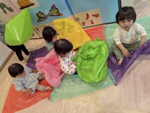 色とりどりのカラーポリ袋に触れながら、先生やお友だちと「いないいないばあ!」と笑い合ったりして、元気いっぱい遊んでいました😆🎵