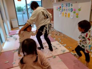 身近な素材で、たくさん体を動かしながら楽しく遊ぶことができました♪