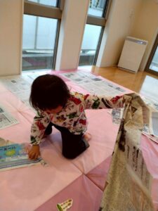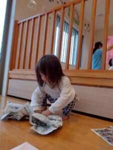 新聞紙の下に、春のものを隠すと「ビリビリ!」とやぶって探していました😊