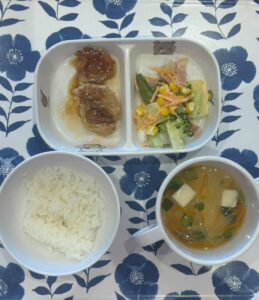 今日の献立です🍚 (普通食) ⭐️おやつ ・市販菓子 ・牛乳 ⭐️給食 ・白ご飯 ・白身魚のごまだれがけ ・ブロッコリーのサラダ ・中華風スープ