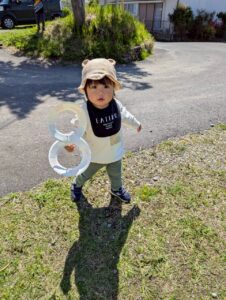 今日はお天気も良かったので以前みんなで作った風車で遊びました😊💕 風が吹くとクルクルと回る風車に嬉しそうな表情を見せてくれました😊