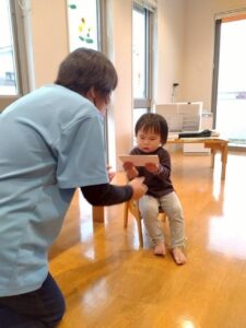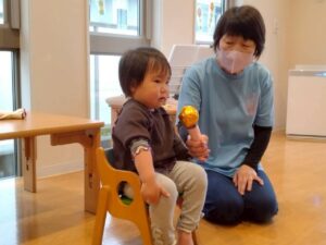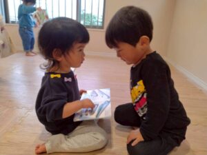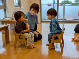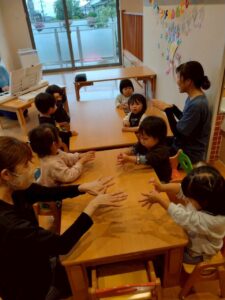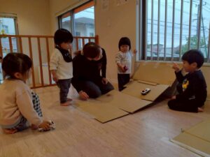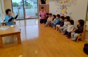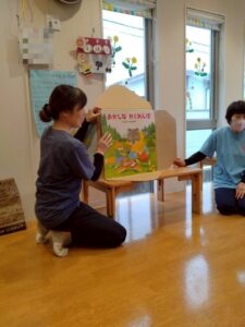 大型絵本や、どんな色が好きの手袋シアターなど保育者からの出し物に興味を持ってくれるお友だちでした♪