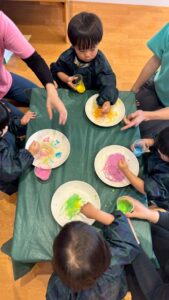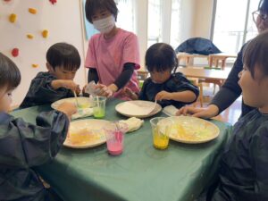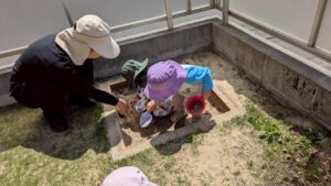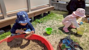 2歳児さんは製作をしたあと、外に出て砂遊びや野菜収穫などして楽しみました🎨🪣🌱