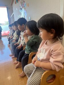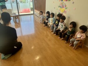 「なにかな?」の問いかけに、「ぶーぶー!」「バス!」と元気に答える子どもたち😊